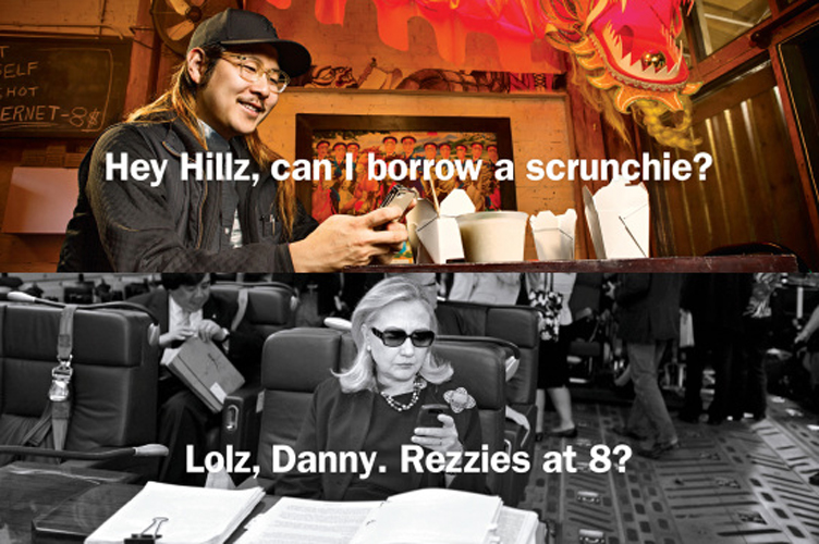 Last night Time Out New York hosted their annual food and drink awards ceremony, and this year the theme for the event was internet memes. A sneak peak of one of the altered photos came via TONY’s Twitter page early in the evening, showing Danny Bowien asking Hillary Clinton for a scrunchie. Well played team Time Out.