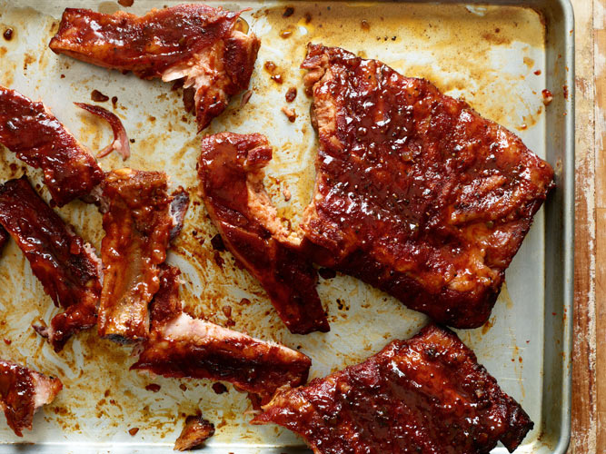 Return to the cooker for 30 minutes. Open the packages and check for doneness by pushing a toothpick into the meat. It should go in and out very easily. If you want the ribs more tender, just wrap them back up and cook a little longer. When they’re as you like them, transfer to a sheet pan. Remove the foil and return the ribs to the cooker meat-side down. Brush the bone side liberally with barbecue sauce and cook for 10 minutes. Flip the ribs and brush the meat side liberally with barbecue sauce. Cook for 20 minutes. Transfer to a cutting board and tent loosely with foil. Let rest for 5 minutes. Slice each rib individually and transfer to a platter to serve.