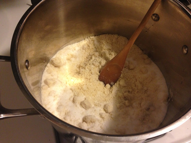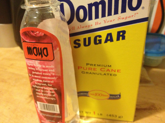 Problems arose quickly. After combining one pound of almond meal and one pound of white sugar in a large pot on the stove, I began sprinkling the mixture with rosewater over a medium flame. I figured the mixture should have a slightly moist consistency, so I may have been a bit liberal with the sprinkling. I stirred continuously, but removed the mixture before it could get burned, then put it in a dish coated with powdered sugar.