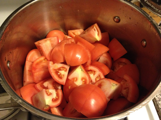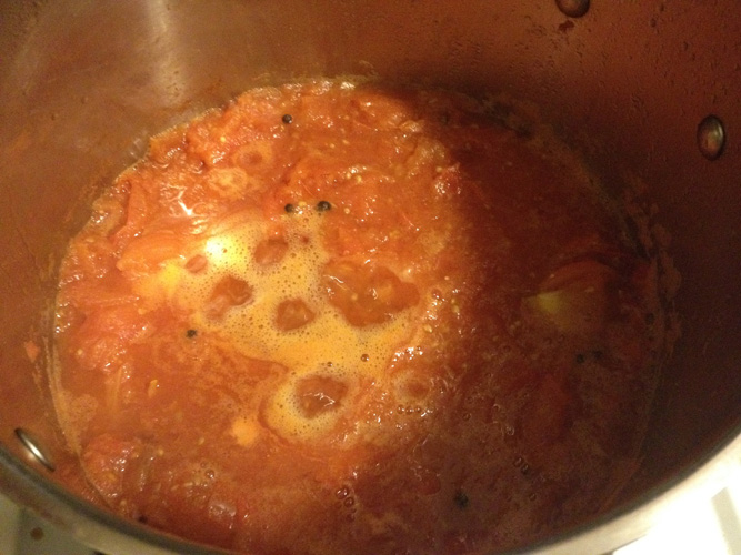 The problem with making this recipe in December is that tomatoes are horribly out of season, and the average C Town “slicing tomato” is too thick and dry to strain. So I mashed them together as best I could, removing seeds and skins when possible, and set it to boil with all the spices.