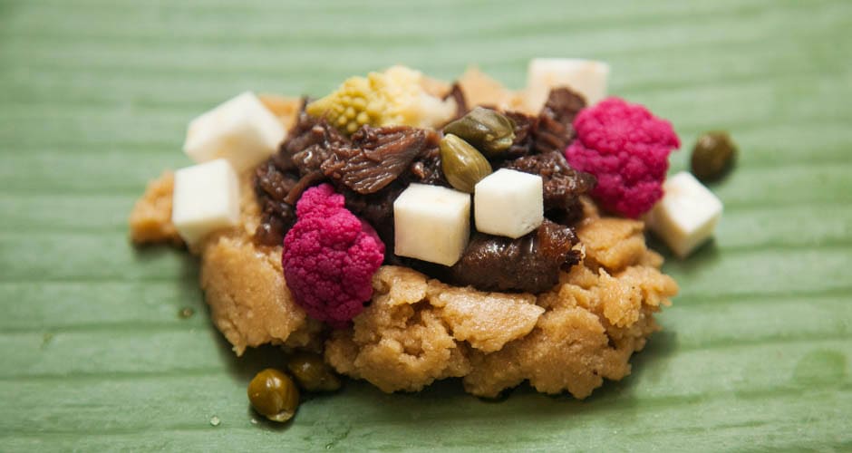 The chef cautions, “This is not a dish for someone who wants to have a healthy Christmas. You’ll see how much fat goes into the masa.” Ruiz used Wagyu beef fat to keep it from being dry—because that’s how he rolls—but you can use lard, duck fat, or regular suet. He also incorporated the reduced reindeer braising liquid into the tamal dough for additional flavor.