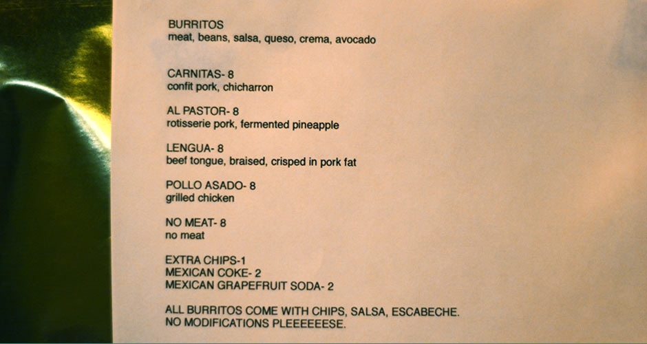 We were a little worried that Danny, who established his first restaurant in San Francisco’s Mission district, would offer rice as a burrito filling. Fortunately, there was no rice to be found. Unfortunately, last night may have been the only chance we will ever get to taste Mission Cantina burritos, as Danny Tweeted, “probably not gonna do burritos when we open.” What will they be serving at Mission Cantina? The cashier manning the burrito operation last night simply said, “Mission Cantina will be ‘purely Mexican’ the way Mission Chinese is ‘purely Sichuan.'”