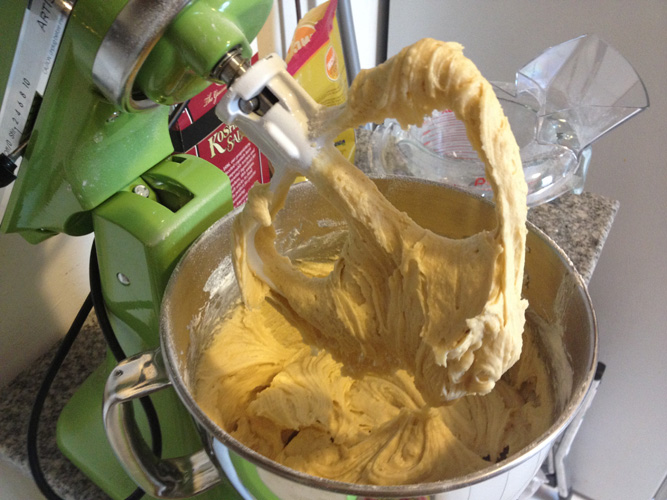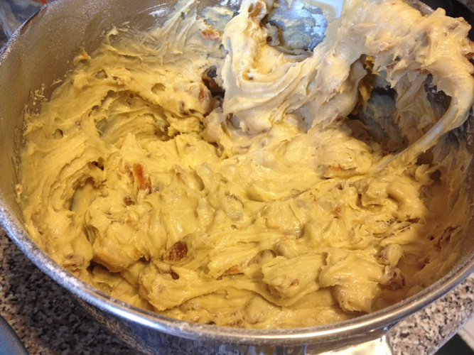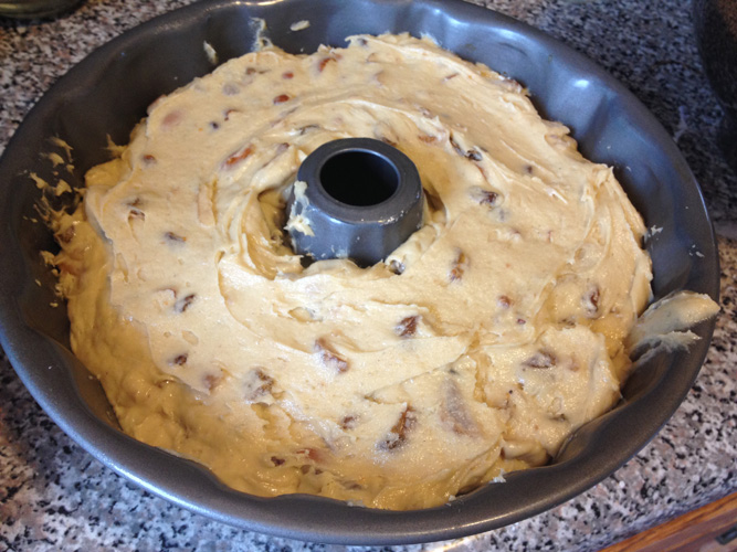 I followed the classic mix-dry-ingredients-into-wet ingredients method here, creaming the butter and sugar together first, then adding the eggs, milk, and honey. To that I added the mixture of flour, baking soda, and spices. Once that came together, I added the chopped figs, raisins, and almonds, and I threw the thick mixture (which really had more of a cookie batter consistency) into a bundt pan and baked it at 350 degrees for what wound up being about an hour.