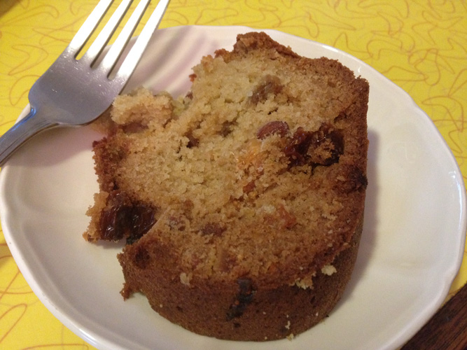 The result? An actually pleasing, fruity cake! Thinner cake pans may actually work better than a large bundt, to let the thick batter cook through without burning the crust, and a simple glaze would be a great addition to add some sweetness. But I’m just thinking about the french toast I want to make out of this over the next few days.